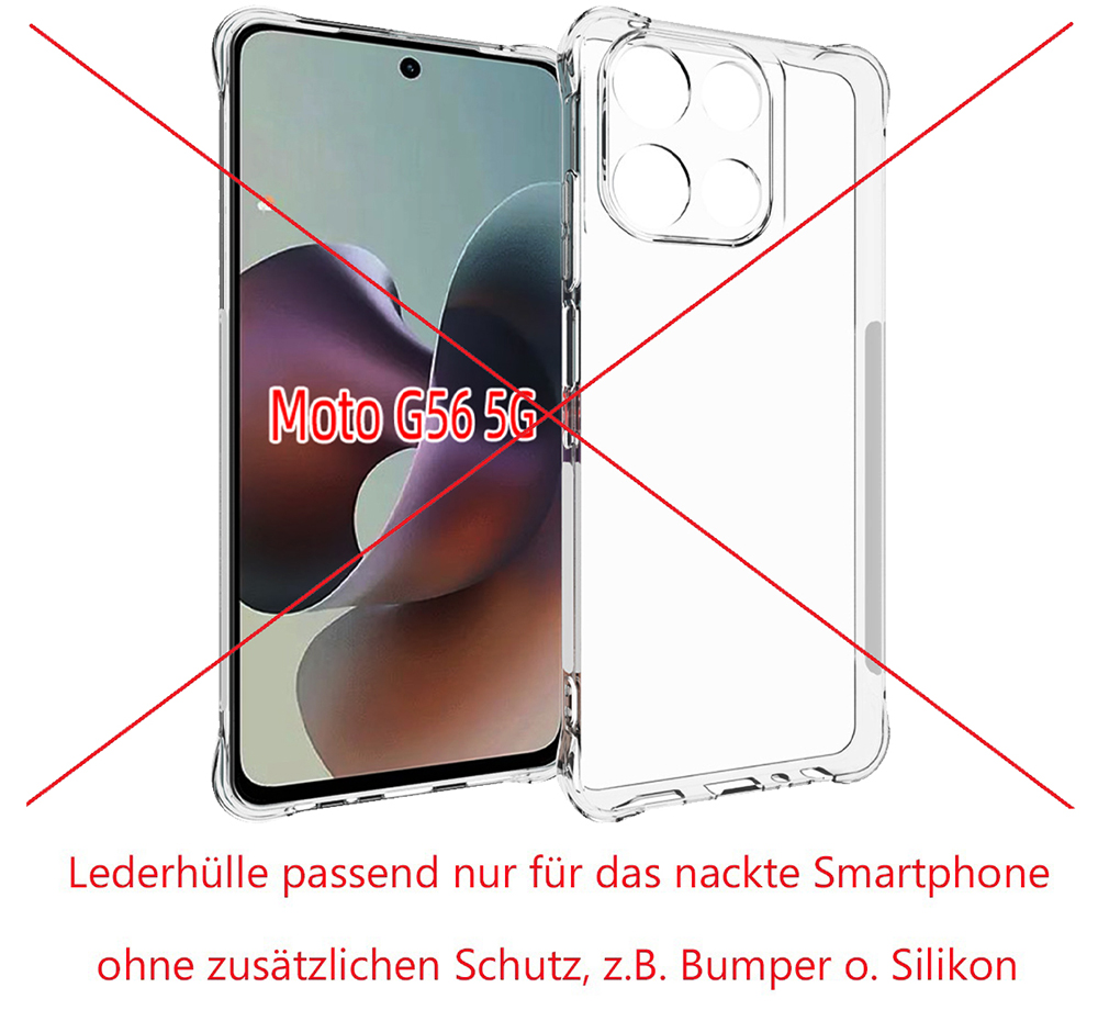 - Beachten Sie bitte darauf, dass dieses Etui auf die exakte größe des Motorola Moto G56 5G OHNE Bumper, Silikon oder sonstige Hüllen angepasst ist!