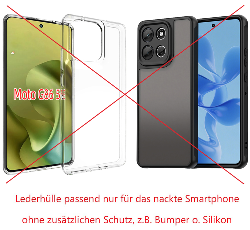 - Beachten Sie bitte darauf, dass dieses Etui auf die exakte größe des Motorola Moto G86 5G OHNE Bumper, Silikon oder sonstige Hüllen angepasst ist!