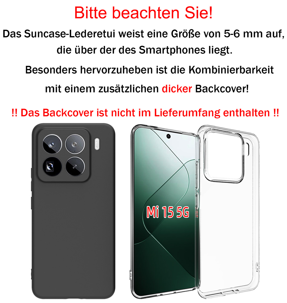 - Passend für das Xiaomi 15 5G (ACHTUNG: Das angebotene Suncase passt nur für das Gerät mit ein Zusätzlicher dickeres Silikon Case/Bumper/Backcover)
