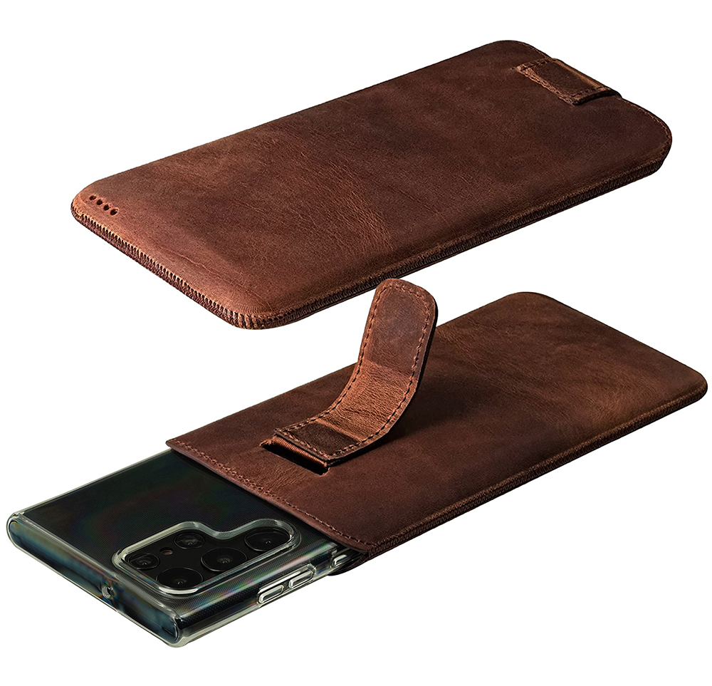 - Mithilfe der Lasche lässt sich das Handy bequem aus der Tasche herausziehen.