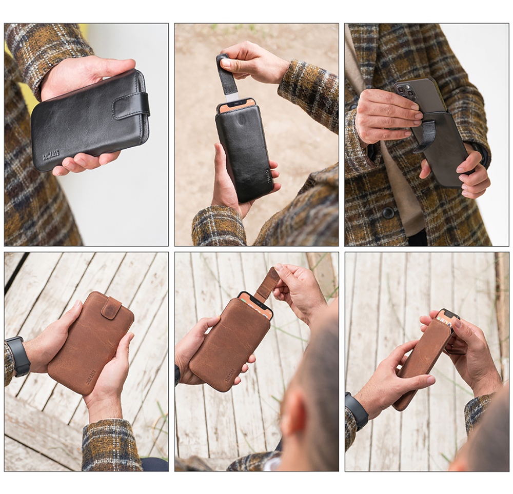 - Mithilfe der Lasche lässt sich das Handy bequem aus der Tasche herausziehen.